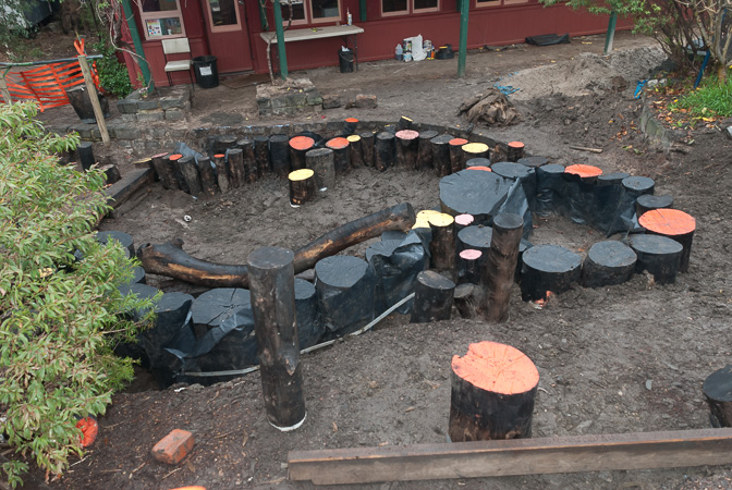 Children were provided with the new sand pit and log structures creating a natural imaginative play surface. The provision of multiple pit sizes allowed for both group or individual play.