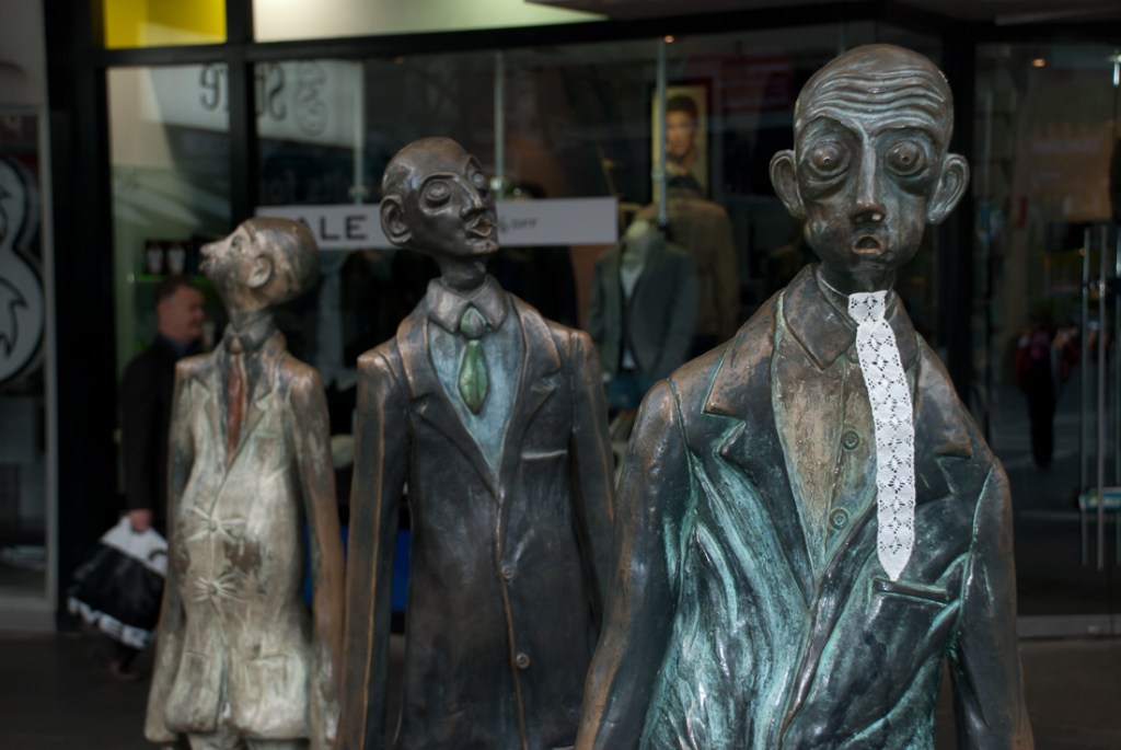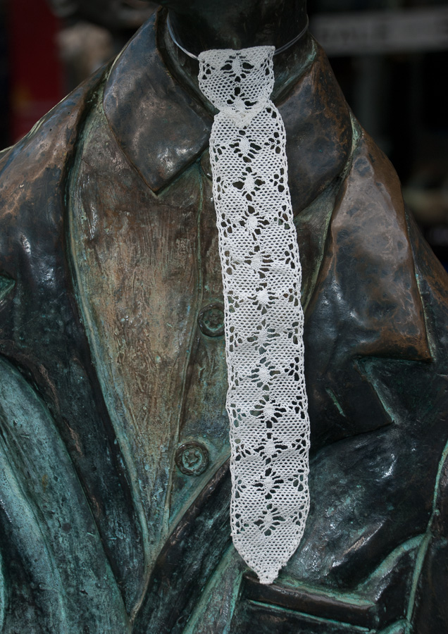 This torchon tie was installed on the Three businessmen who brought their own lunch; Batman Swanston and Hoddle on the corner of Bourke and Swanston streets in Melbourne. The sculpture itself was unveiled in 1994 as a gift from the people and government of Nauru and it was made by Melbourne sculptors Alison Weaver and Paul Quinn. This playful sculpture is much loved and its position and size leaves it begging for further adornments and offerings. The lace tie adornment was a feature in October 2010.