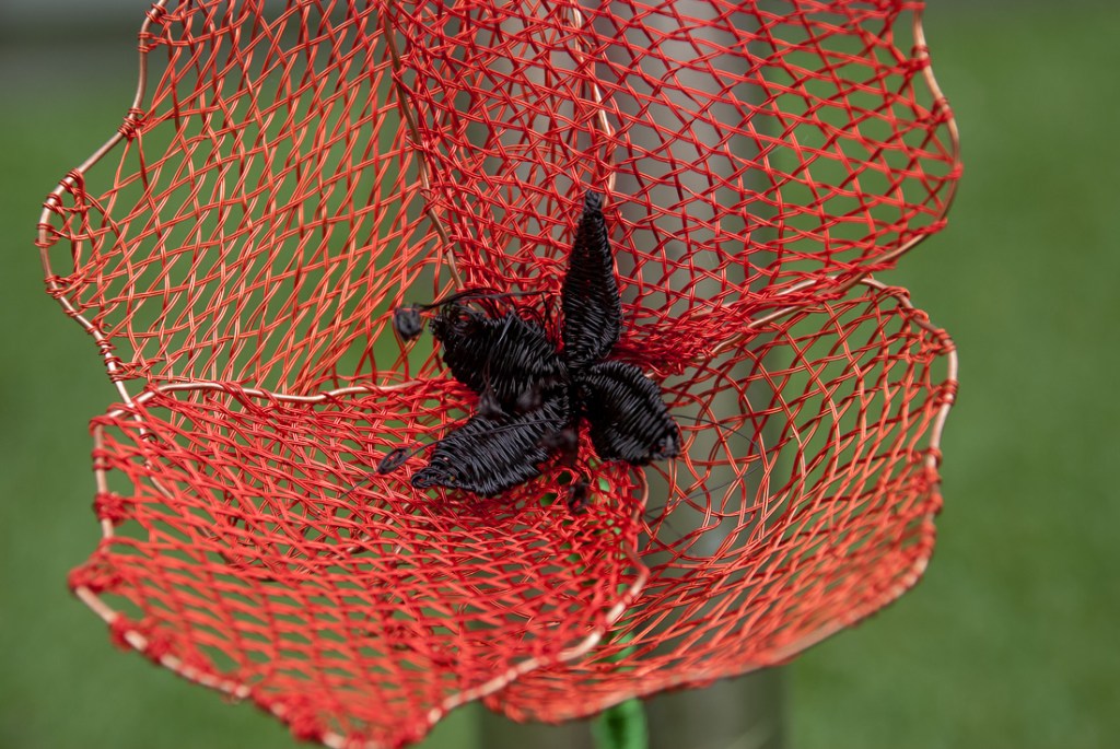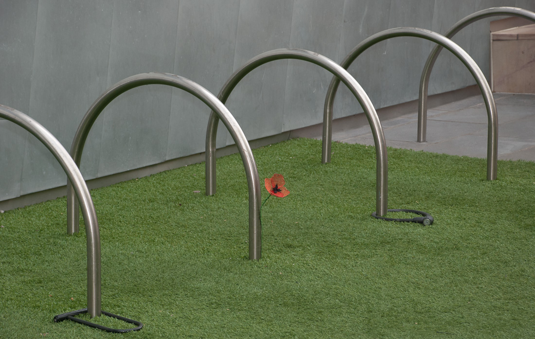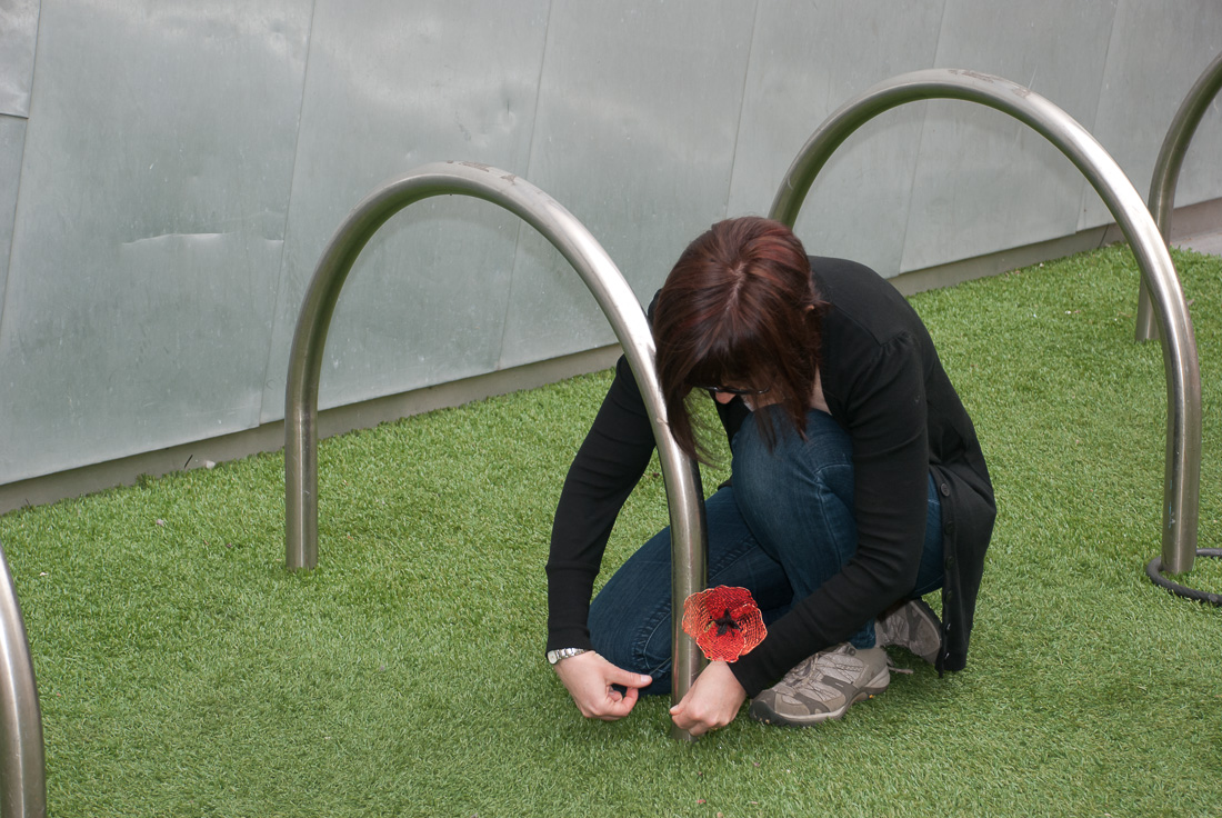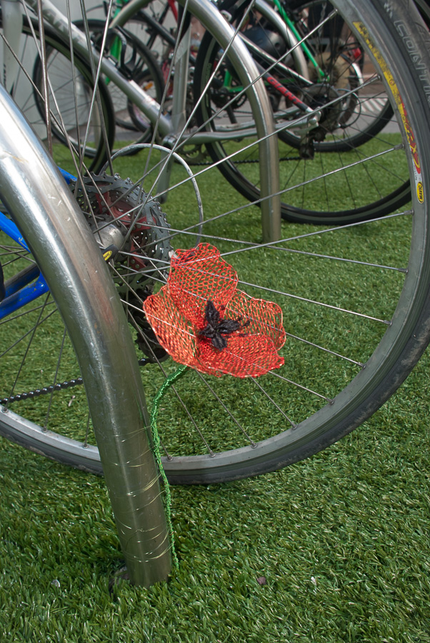 This wire lace poppy was installed bursting from the grass at Federation Square’s Amphitheatre on the morning of Remembrance Day 2010. Its metallic finish seemed to merge into the facade of the square and it was soon surrounded by bikes.