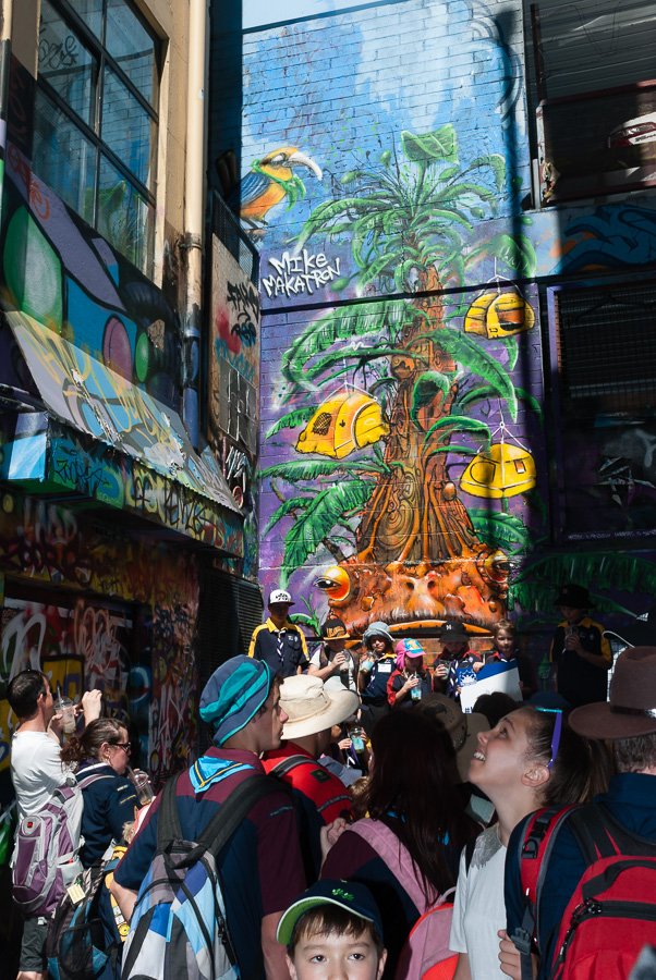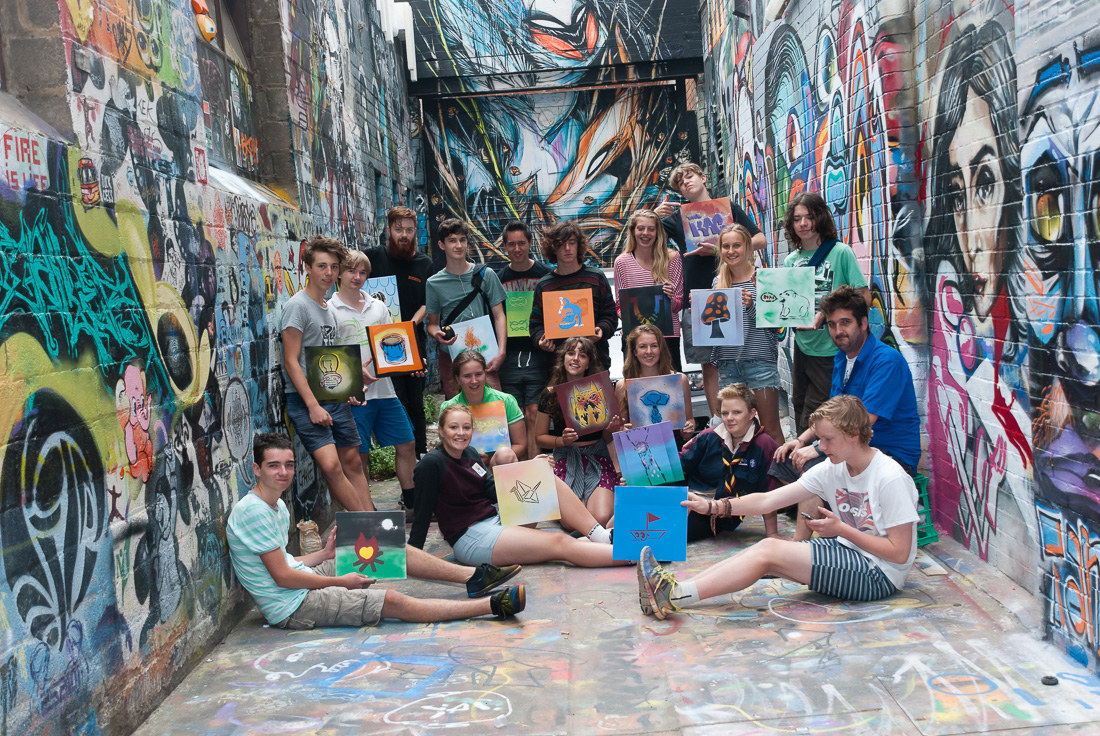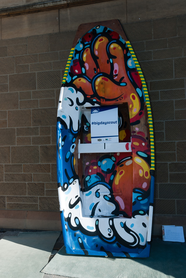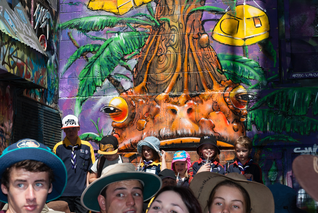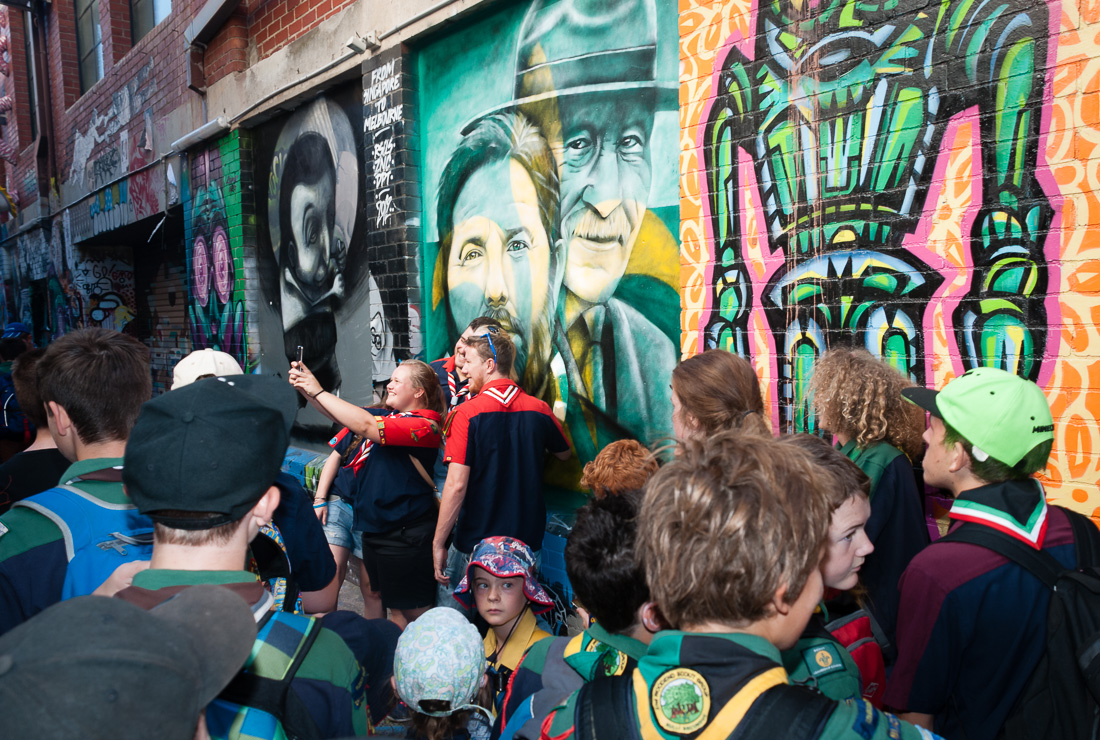 Around 10,000 Scouts arrived at Federation Sqaure in Melbourne to participate in a wide game, like a scavenger hunt, around the CBD. The objects to find? Street art, installations and canvases that were made for the event. When finished the Scouts then headed to the Sidney Myer Music Bowl for a concert and activities.