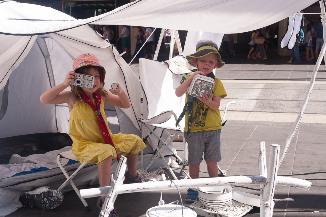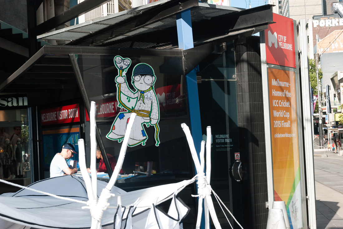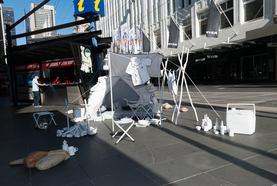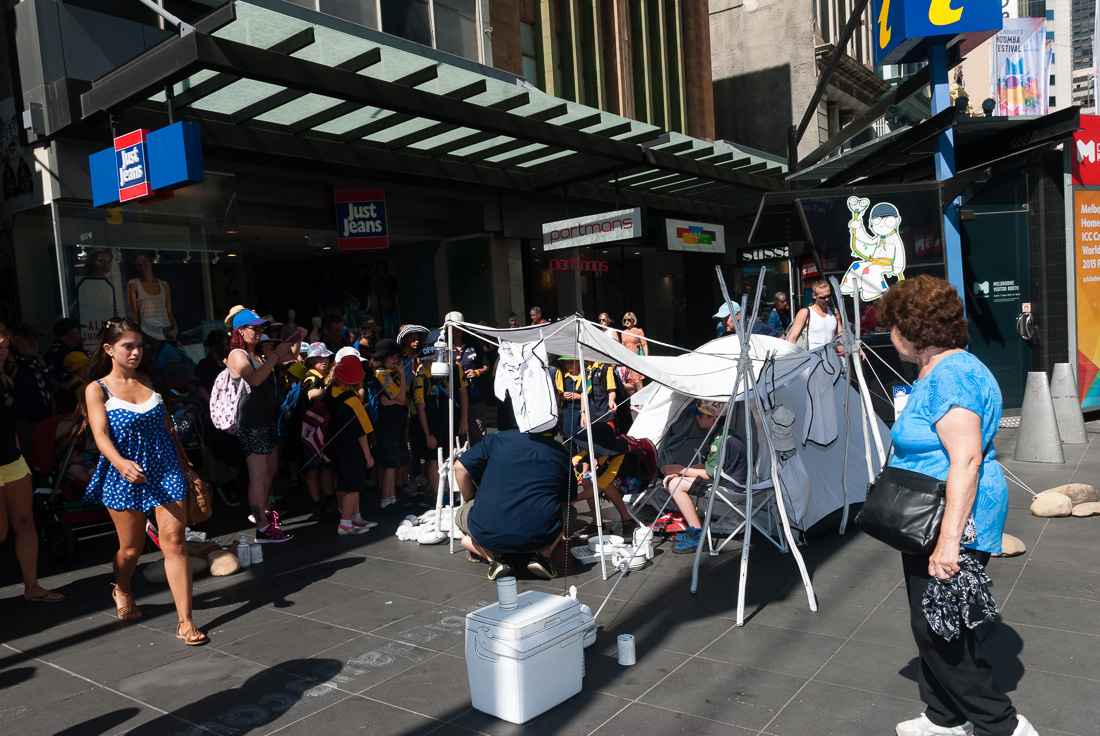 Georgina Humphries ‘scoutified’ her sketched tent installation with the help of 15th Essendon Scouts. This was placed in Bourke St Mall for the day and had a guest appearance of an abseiler by Lifetime.
