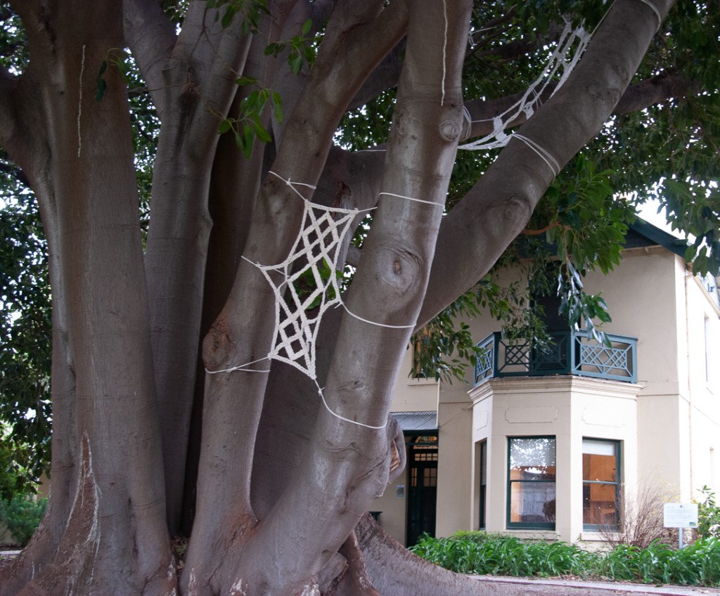 The lace formed an open web like structure within the tree for the public to discover as part of the festival. The smallest piece was 800mm x 400mm, the middle 1200mm x 1800mm and the largest 2500mm x 2500mm. Around 900 metres of rope was used to complete the project. Entwined in the Morten Bay Fig at the entrance of the property, Connection 2 invited viewers to consider the relationship between architecture, history and the community today.