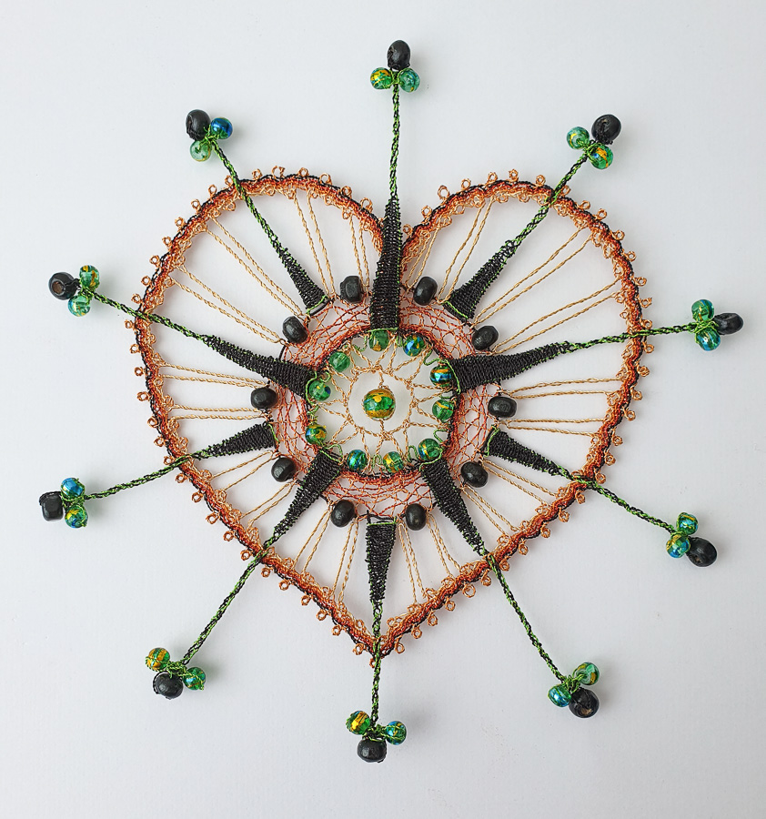 In 2017 The Lace Heart Art Challenge was launched through the New School of Lace with the aid of Lenka Suchanek. Lenka first inspired me to try wire lace in her Wire Lace Workshop held in Melbourne back in 2000. I was instantly drawn to the sculptural quality of wire – suddenly there were so many more possibilities for lace forms.