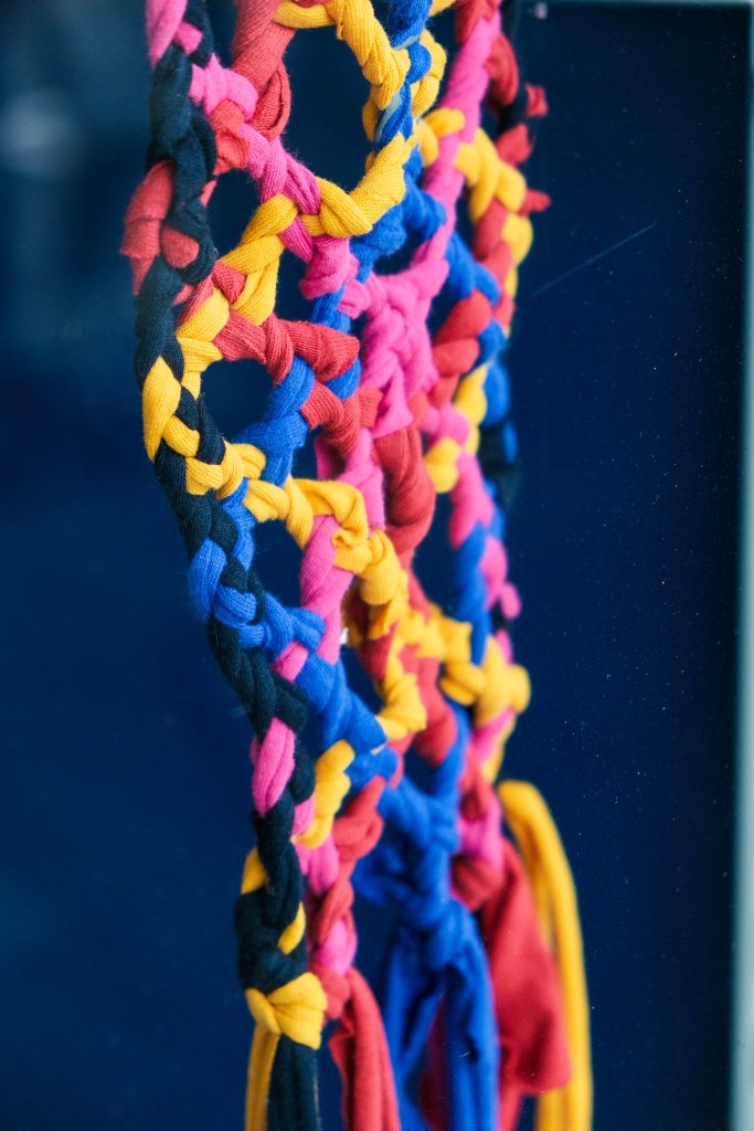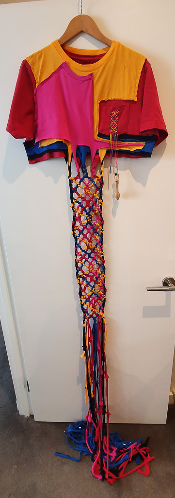 The second artwork was made for Kids 1st Op Shop in Rosanna. For this piece I set myself the challenge of using items purchased from the Op Shop and transforming them into a piece that showcases the art of lace making. This piece shows what is possible when imagination and creativity mix with pre-loved objects. The original objects, 5 t-shirts – each filled with its own memory, are transformed into new possibilities.