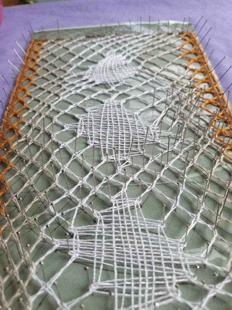 Each design was sent, with accompanying threads and working notes, to one of 15 lacemakers who contributed to making the lace for the artwork. Large block pillows or foam panels allowed the lace to be made in a continuous strip, being stiffened as it was made.