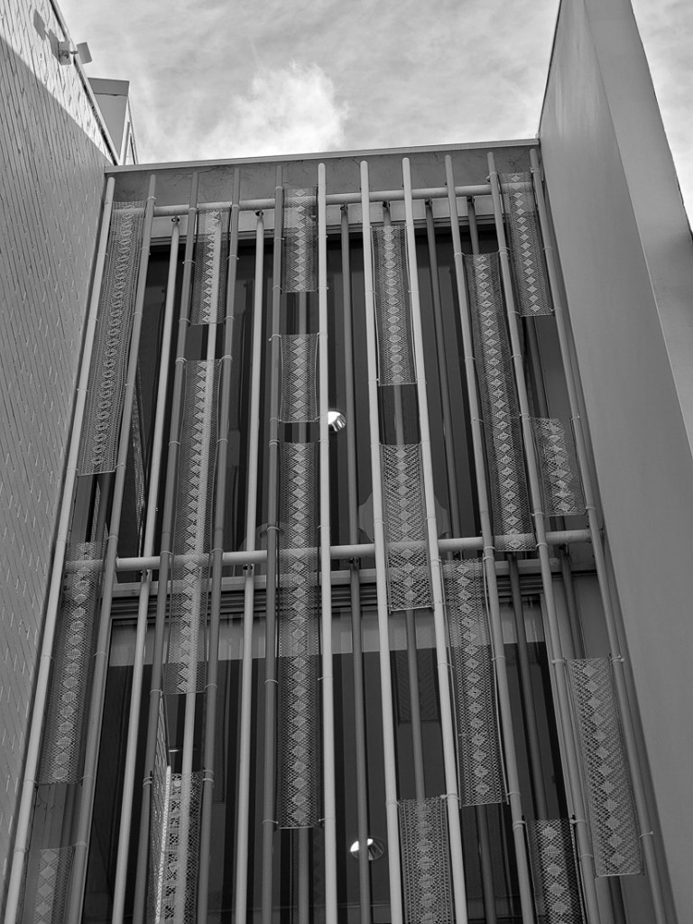 The final piece titled Some Days Are Diamonds And Some Days Are Circles was a site specific piece created for the facade of Gallery 76. The 3 level metal armature of the gallery entrance provided the perfect location for lace enabling it to be viewed up close from the 2nd and 3rd floors while being a statement piece at the entry that welcomed all to the Festival of Lace Exhibition.