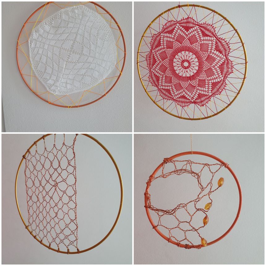 The second was titled Circles of Friendship and Exploration. Members of the Australian Lace Guild and friends were invited to contribute to this installation by sending in remnants of handmade lace and samplers, or to create new lace pieces that fit within circular rings. The loose theme of autumn tones was given.